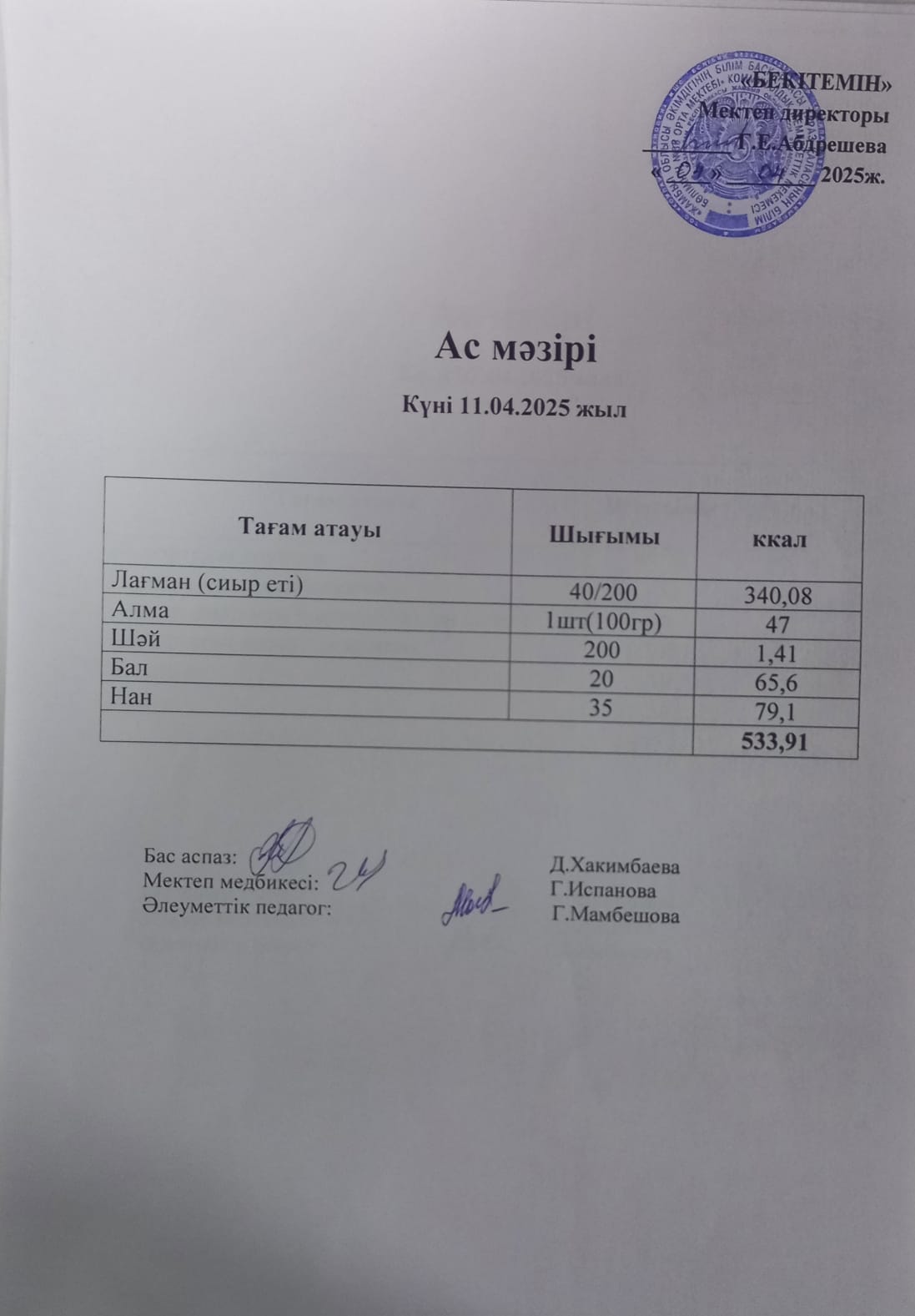19 желтоқсан 2024 Күндік ас мәзірі