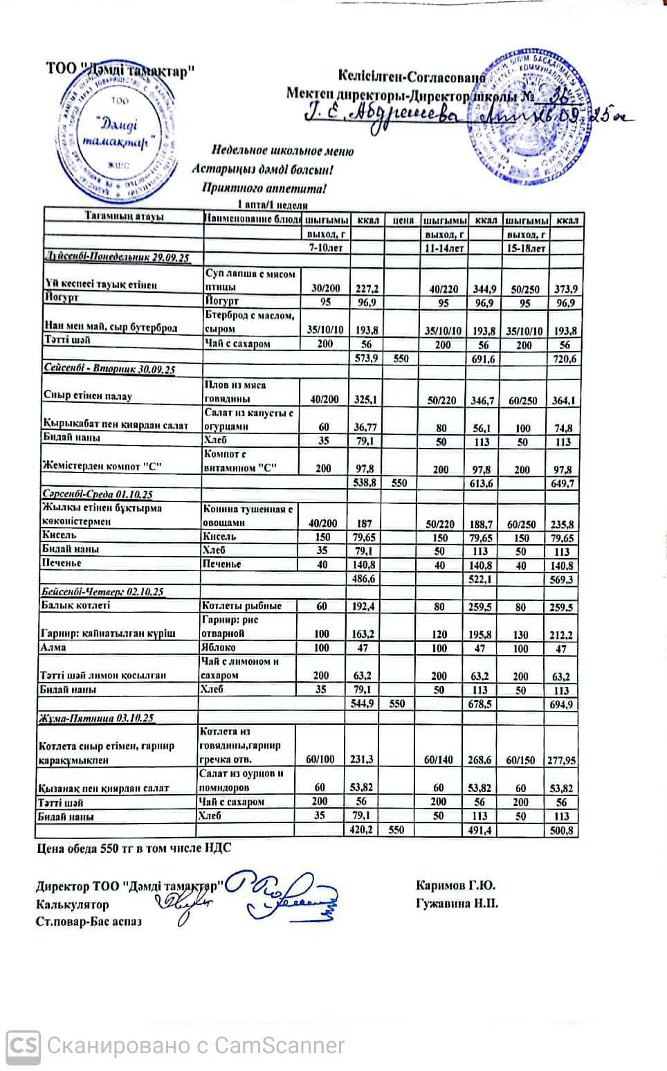 Апталық ас мәзірі » СШ №36