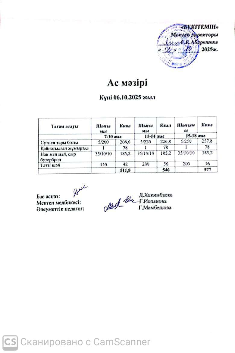 20 наурыз 2025 Күндік ас мәзірі