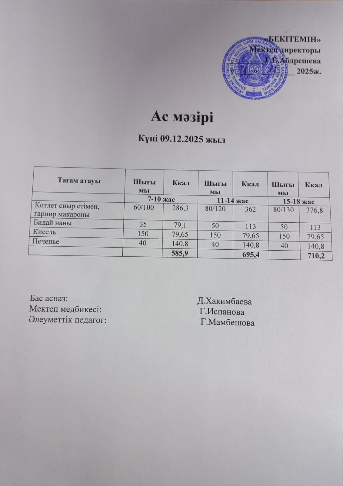 20 желтоқсан 2024 Күндік ас мәзірі